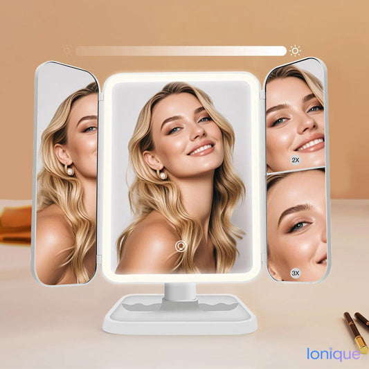 Ionique | Espelho Trifold LumiGlow – 3 Cores LED & Magnificação Panorâmica